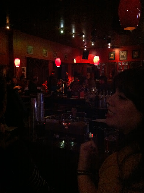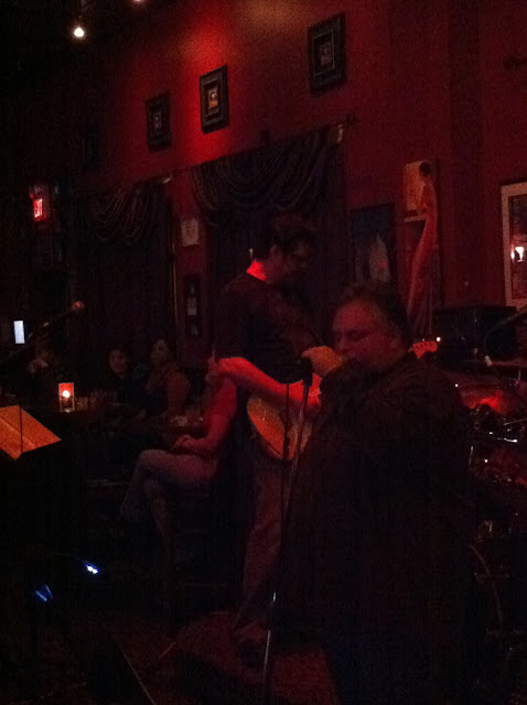 I had to peel my gal away from the gossip fest that ensued between her and my mom so we could go see my stepdad and his band at Martinis. We arrived to be warmly and drunkenly greeted by Arden and Randy. I broke down and told them the news at which they were ecstatic. Randy bought me a drink and I proceeded to get a little tipsy. haha Dry martini straight up. Took two sips and I was buzzed. Yeah, I'm a lightweight. So I traded him for a beer and he bought me several after that. He also bought my stepdad a few. After the first set, my stepdad came over and greeted us and welcomed Sam into the family. haha